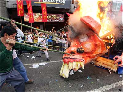 تظاهر کنندگان چپگرا در مانيل، پايتخت فيليپين با چوبهای بامبو بر پيکر عروسکی می کوبند که بدن آن شبيه موش و سر آن به شکل گلوريا آرويو، رييس جمهور اين کشور است. اين راهپيمايی در اعتراض به تلاش خانم آرويو برای اعمال اصلاحاتی در قانون اساسی فيليپين برگزار شد.