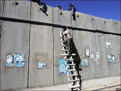 مردان فلسطينی برای شرکت در آخرين نماز جمعه ماه رمضان در مسجد الاقصی در بيت المقدس سعی می کنند با نردبان خود را به آنطرف ديوار امنيتی اسراييل برسانند.
