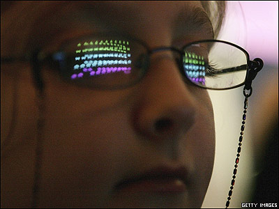 انعکاس صفحه نمايشگر يک بازی کامپيوتری ويديوئی در عينک يک نوجوان در نمايشگاهی در موزه علوم لندن.
