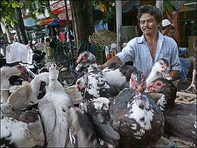 يک فروشنده مرغابی در بازاری در جاکارتای اندونزی. مقامات اندونزی قصد دارند برای جلوگيری از خطر گسترش آنفولانزای مرغی، مرغها و مرغابی ها را از مناطق مسکونی تخليه کنند.