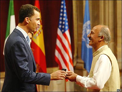 رضا دقتی عکاس 'انجمن نشنال جئوگرافی' در حال دريافت نشان افتخار از شاهزاده فيليپ، وليعهد اسپانيا. آقای دقتی چند ساعت پس از دريافت اين نشان افتخار جايزه آستورياس برای ارتباطات و علوم انسانی را از شاهزاده فيليپ دريافت کرد.