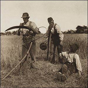 اين عکس بر خلاف مد عکاسی در آن روزها بود که چنين عکسی را از ترکيب چند عکس در تاريکخانه بوجود می آوردند. عکس: برداشت در مزرعه جو 1890