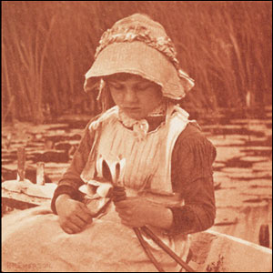 او در نظر داشت که رسوم قديمی زندگی در روستاها را با استفاده از متد جديد عکاسی نشان دهد و موفق شد نوع عکاسی را که واقع گرا به نظر می رسد، ارتقا دهد. عکس: جمع کردن نيلوفر آبی 1886