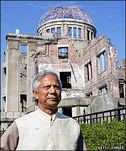 محمد يونس برنده جايزه نوبل صلح امسال در کنار تنها بنای باقی مانده پس از بمباران اتمی شهر هيروشيمای ژاپن