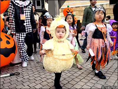 کودکی ژاپنی برای شرکت در مراسم هالووين در شهر توکيو لباس تزيينی به شکل جوجه مرغ را بر تن کرده است. حدود ۳۵۰۰ نفر در يکی از بزرگترين جشنهای هالووين ژاپن شرکت کردند.