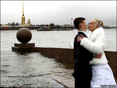 زوجی در کنار رودخانه نوا در شهر سن پيترزبورگ روسيه. افزايش سطح آب اين رودخانه باعث جاری شدن سيل در مناطق جنوبی اين شهر شده است.