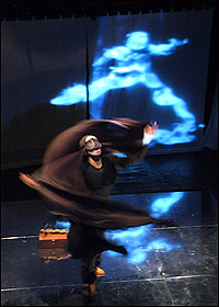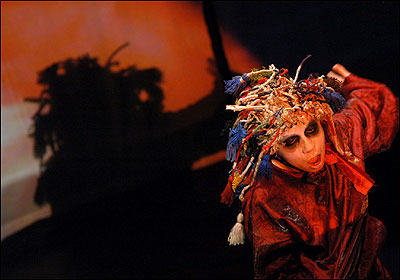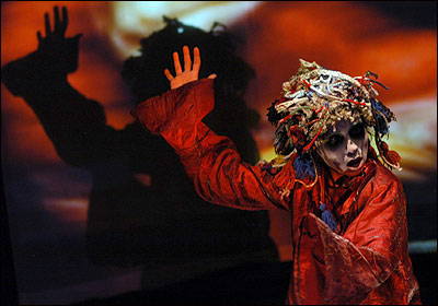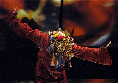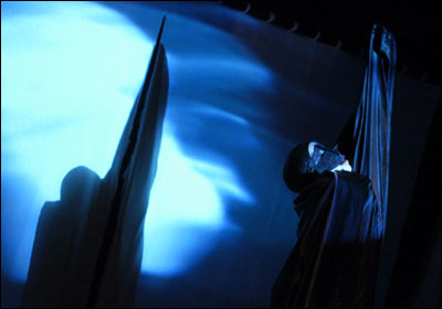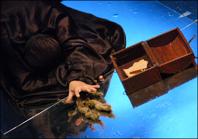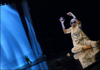 بازیگر نمایش در انتهای هر صحنه از روزنه ای خارج می شود و سپس با شکلی دیگر از همان روزنه به صحنه وارد می شود. مرگ در این نمايش نشان "نیستی" ندارد، بلکه تغییر شکل از حالتی به حالت دیگر است.
