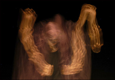 بازیگر روی صحنه هیچ کلامی نمی گوید، ابزار کار او حرکات بدنی به شکل آئینی و اصوات نامفهوم است. ولی مخاطب از گفتار متن تصاویر ویدیویی که شکل تکمیلی بازی روی صحنه است با حرف های گروه اجرایی آشنا می شود.