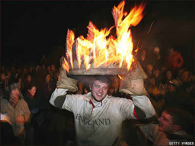 در جریان کارناوال "سینت ماری" در شهر دوون در بریتانیا مردی با بشکه ای پر از آتش بر روی سر از میان جمعیت می گذرد . شرکت کنندگان در این کارناوال که چهار صد سال است برگزار می شود، باید بشکه ای آتشين را تا سر حد توان خود، بر روی سر حمل کنند. |