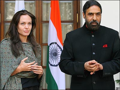 آنجلینا جولی، هنرپیشه هاليوود در سفر خود به هند، به عنوان سفیر حسن نیت سازمان ملل با وزیر مشاور در امور خارجه این کشور ديدار کرد. هدف آنجلینا جولی از این سفر بازدید از وضعیت پناهندگان میانماری در هند است.