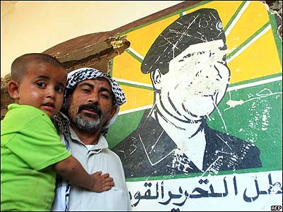 تصویری ازصدام بر روی دیواری در شهر بصره. قاضی دادگاه روز يکشنبه پنجم نوامبر رئيس جمهور سابق عراق را به جرم 'جنايت عليه بشريت' به اعدام با طناب دار محکوم کرد