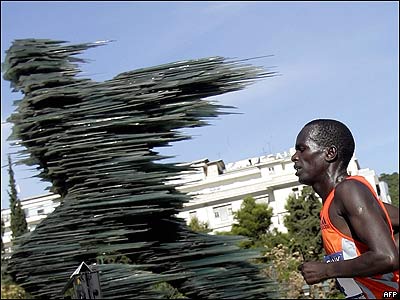 یک دونده کنیایی در حال عبور از مقابل یک مجسمه شیشه ای در مسابقات دو ماراتن در آتن یونان