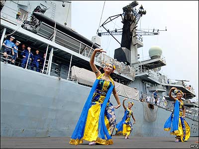 رقصنده های اندونزیایی در کنار یک ناو جنگی متعلق به نیروهای دریایی بریتانیا که برای یک تمرین مشترک وارد بندر جاکارتا شده است.