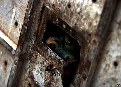 يک اوانگوتان نجات يافته در اندونزی، از قفسش به بيرون گاه می کند. گفته می شود که دهها اوانگوتان به دليل آتشسوزی از جنگل ها خارج شده اند.