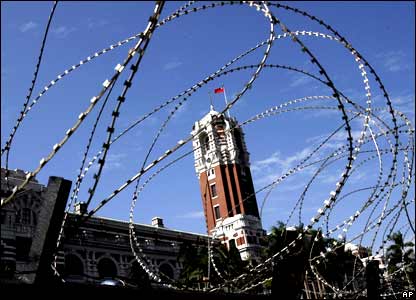 سيم خاردار درمقابل دفتر ريييس جمهور تايوان. مخالفان به دليل اتهام فاسد، او را تحت فشار گذاشته اند تا از مقام خود استعفا دهد. |