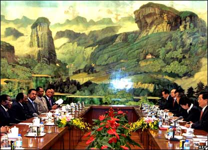 رابرت موگابه، رييس جمهور زيمباوه (سمت چپ)، در ديدار با هو جينتائو رييس جمهور چين در "سالن بزرگ خلق" در پکن.
