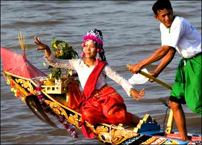 زنی در پايتخت کامبوج، پنوم پن، به مناسبت فستيوالی سالانه در قايقی چوبی می رقصد.
