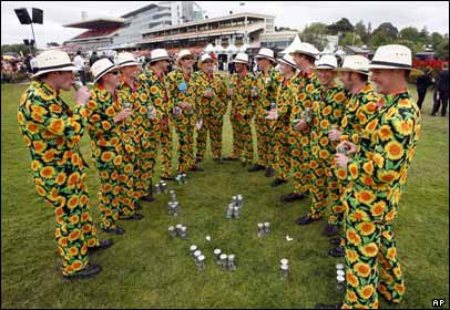 تعدادی از تماشاچیان نیوزیلندی که برای تماشای مسابقه اسب سواری جام ملبورن به استرالیا رفته اند.