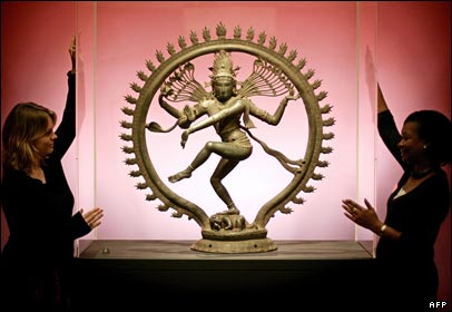 مسجمه ای منسوب به "شیوا" الهه هندو. این مجسمه برنزی که در قرن یازده میلادی ساخته شده، در آکادمی سلطنتی هنر در لندن به نمایش گذاشته شده است |