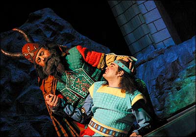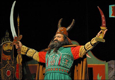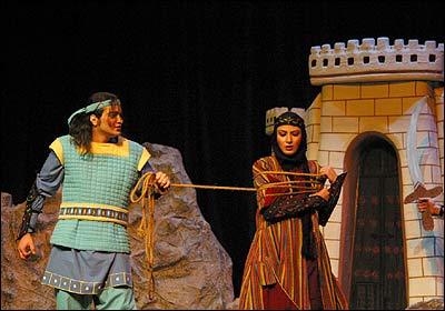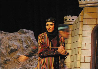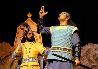 نمایشنامه 'رستم و سهراب' به کارگردانی رسول نجفیان بر اساس 'رستم و سهراب' شاهنامه فردوسی از اول آبان ماه در فرهنگسرای نیاوران بر روی صحنه است. از راست: شهرام نجاتی ( شاه سمنگان)، مریم رحیمی ( تهمینه)، کاظم هژیرآزاد(رستم)، نادر نوری زاده ( ژنده رزم)
