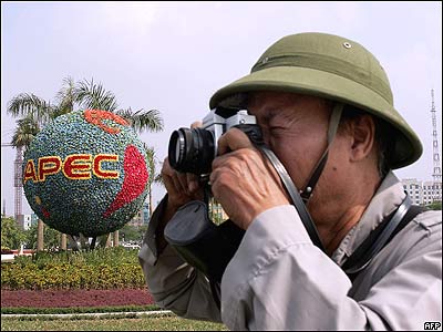 عکاسی در حال تصوير برداری از يک سبد گل که به مناسبت برگزاری اجلاس همکاری کشورهای آسيايی و اقيانوسيه (اپک) در شهرهانوی در ويتنام در يکی از ميدانهای اصلی اين شهر گذاشته شده است.
