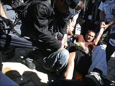 برگزاری جشن خيابانی همجنسگرايان در بيت المقدس با مخالفتهای زيادی روبرو شده است. در عکس فوق پليس اسراييل در حال جابجايی بکی از مخالفين برگزاری اين جشن ديده می شود. گفته می شود که بيش از دو هزار نفر در اين مراسم شرکت داشته اند و سه هزار پليس برای تامين امنيت اين مراسم در خيابانهای شهر مستقر شده اند.