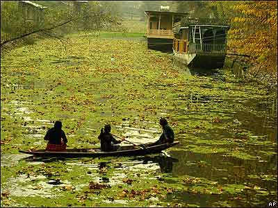 ساکنان کشميری حاشيه درياچه دال در منطقه توريستی سرينگار هند در حال قايق سواری بر روی اين درياچه.