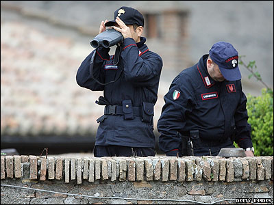 ماموران امنيتی ايتاليا از بالای قلعه محل ازدواج زوج هاليوودی، منطقه را تحت نظر دارند.