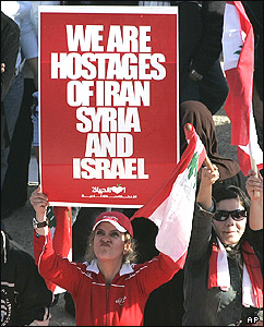 تظاهر کننده لبنانی پلاکاردی را حمل می کند که روی آن نوشته شده 'ما اسير کشور های ايران، سوريه و اسرائيل هستيم'. امروز هزاران تن از مردم لبنان در مراسم يادبود پی ير جميل، وزير صنايع اين کشور که دو روز پيش ترور شد، شرکت کردند.