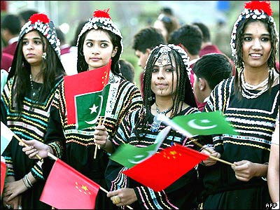 دختران پاکستانی با لباس محلی مردم شمال غرب اين کشور از سفر هو جينتائو، رئيس جمهور چين به پاکستان استقبال می کنند. |