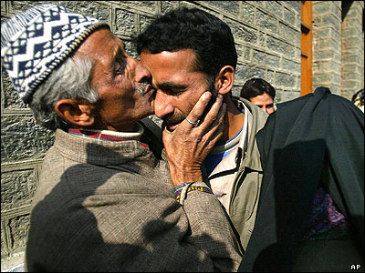 پدر يک عضو از گروهای مسلح کشمير پسرش را که اسلحه اش را به زمين گذاشته می بوسد. ارتش هند می گويد بيست مرد مسلح کشميری در سرينگر دواطلبانه اسلحه شان را تسليم ارتش هند کردند