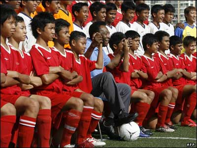 پله، بازیکن مشهور سابق تیم ملی فوتبال برزیل، در کنار یک تیم دانش آموزی در سنگاپور. قرار است يک استادیوم فوتبالی به نام این ورزشکار در شهر لیون در سنگاپور ساخته شود..