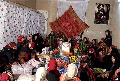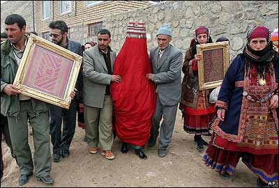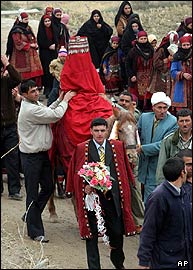داماد در جلو و عروس در پی او پس از پايان مراسم به سوی خانه خود می روند.