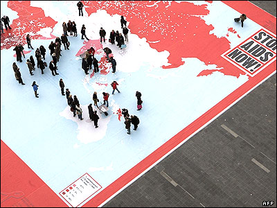 به مناسبت روز جهانی ايدز يک نقشه جهان که يکصد و هفتاد متر مربع پهنا دارد در يکی از ميدان های مشهور شهر لاهه پهن شده است. |