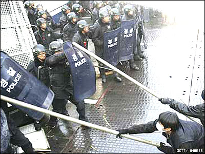 تظاهر کنندگان در سئول پايتخت کره جنوبی در حال درگيری با پليس ضد شورش. اين تظاهر کنندگان به اصلاحات تازه قانون کار دراين کشور معترض هستند.