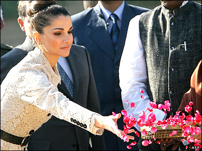رانيا ملکه اردن در حال گلباران بنای يادبود مهاتما گاندی در دهلی نو، هند. ملک عبدالله، پادشاه اردن و همسرش رانيا برای يک سفر سه روزه رسمی به هند رفته اند.