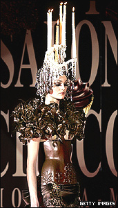 يک مانکن روسی در حاليکه لباس ساخته شده از شکلات به تن دارد در مراسم افتتاح يک فروشگاه شکلات در مسکو.