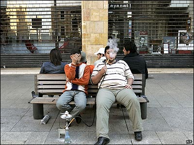 در هفتمين روز تظاهرات ضد دولتی در لبنان دو فروشنده جلوی دکان های بسته شان با کشيدن قليان به اعتراض شان ادامه می دهند.
