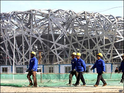 کارگران چينی مشغول ساخت استاديوم مشهور به "خانه پرندگان" که قرار است مراسم افتتاح مسابقات المپيک 2008 پکن در آن برگزار شود.