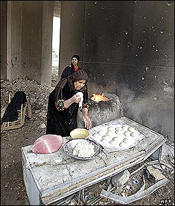 زن بی بضاعت عراقی در زير يک پل در مرکز بغداد در حال تهيه نان برای بچه هايش است. او می گويد از زمان سقوط صدام حسين تا حال شرايط زندگی برای او و شش بچه اش دشوارتر شده است.