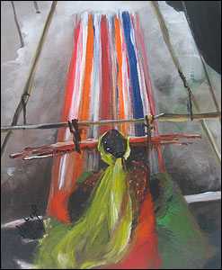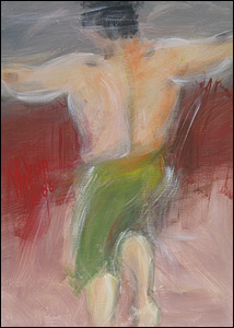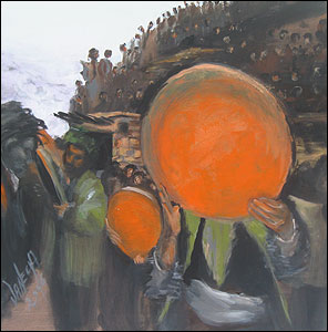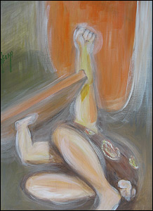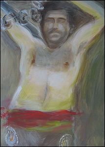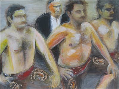 کباده - "پهلوانان زورخانه را (نقاشی کردم) که با افتخار شلوارهای پوشیده از بته جغه برگرفته شده از سرو آریایی را، به نشان فروتنی شرافتمندانه به پا کرده و در گود زانو زدهاند."