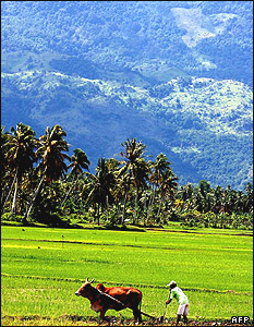 يک کشاورز در "باند آچه" در حال شخم زدن. بيشتر زمینهای اين منطقه از اندونزی در اثر سونامی صدمه زيادی ديده است |