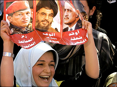 يکی از متعرضين در لبنان پوستری از عکس های هوگو چاوز رئيس جمهور ونزوئلا، حسن نصرالله رهبر حزب الله و جمال عبالناصر رئيس جمهور سابق مصر را در دهمين روز تظاهرات ضد دولتی در لبنان با خود حمل می کند