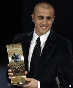 فابیو کاناوارو، بازیکن تیم ملی فوتبال ایتالیا، در حال دریافت جایزه بهترین بازیکن فوتبال سال در مقر اصلی فدراسیون بین المللی فوتبال در زوریخ.