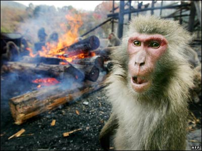 میمون نقاب دار در کنار آتشی در شهر اینیاما در کشور ژاپن. اين شهر محل زندگی تعداد زیادی میمون است و قرار است که در طول زمستان برای گرم نگاه داشتن این میمونها آتشی در محلی در این شهر برپا نگاه داشته شود.