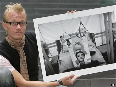 يان گراروپ، عکاس دانمارکی، در حال نشان دادن یکی از عکسهای خود که برنده عکس خبری سال یونیسف شده است. این عکس یک دختر پنج ساله آسیب دیده در زلزله پاکستان را نشان می دهد.