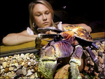 خرچنگ نارگیل خوار در یک آکواریوم در ملبورن استرالبا. این خرچنگ که بزرگترین نوع در بین گونه های مختلف خرچنگ است، این توانایی را دارد که از درخت نارگیل بالا رود و یک نارگیل چیده و آن را به طور کامل بشکند.