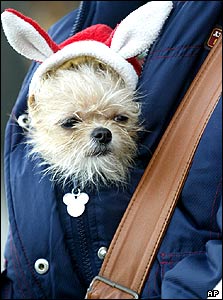 سگ کوچکی با کلاه بابانوئل برای گرم شدن به کاپشن صاحبش پناه برده است.