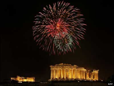 آتش بازی در کنار بنای تاریخی آکروپلیس در آتن یونان در هنگام آغاز سال نو میلادی