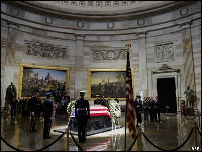 پیکر جرالد فورد، سی و هشتمين رييس جمهوری آمريکا، برای مراسم خاکسپاری که قرار است امروز برگزار شود به کیپتول هیل، ساختمان مجلس سنا و نمایندگان آمریکا، منتقل شده است |